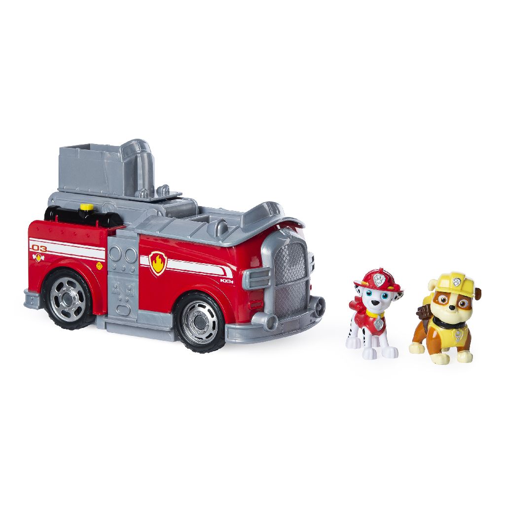 Figurinele Marshall și Rubble sunt gata să pornească în misiune. Vehiculul se împarte într-un vehicul de urmărire super rapid și altul dotat cu bară de remorcare specială. La volan, puii curajoși își unesc forțele pentru a învinge obstacolele și a ajuta prietenii.