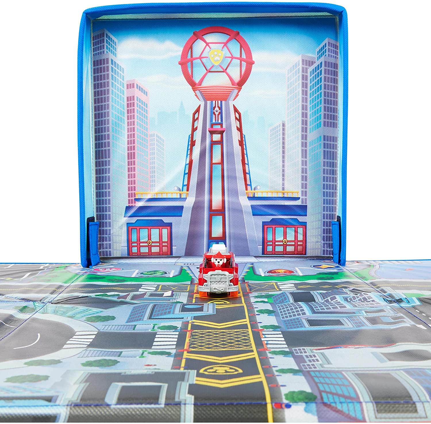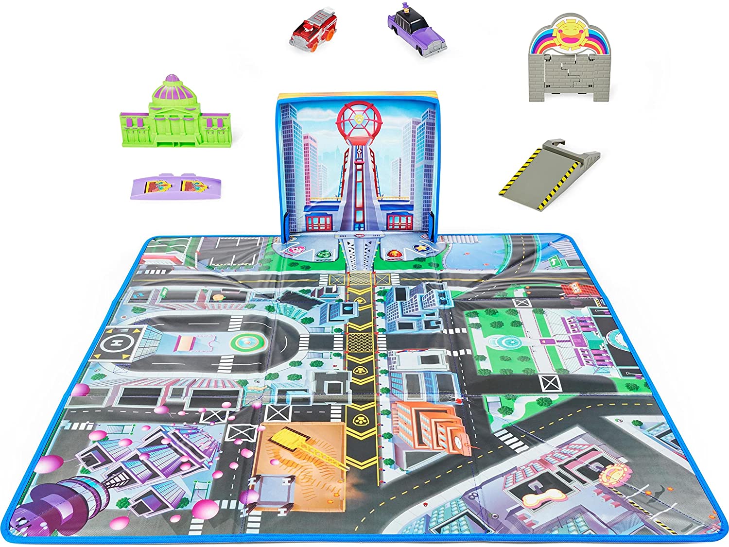 Pune in scena misiunile de salvare in mare viteza Patrula Catelusilor True Metal pe covorul tematic Golful Aventurii! Acest set exclusiv de joaca include vehiculele True Metal la scala 155 a lui Marshall si a Primarului Humdinger pe care nu le vei gasi altundeva, doua accesorii pentru joc si un covor de joaca tematic Patrula Catelusilor care atunci cand se ruleaza devine o cutie de depozitare pentru jucarii. Asaza covorul si jucariile in orice camera iar apoi foloseste-ti imaginatia pentru a-ti inventa propriile aventuri! Harta Golfului Aventurii de pe covor va adauga o noua dimensiune aventurilor tale alaturi de vehiculele tale din metal turnat. Împinge masinile pe strazile orasului pentru a-l ajuta pe Marshall sa salveze Primaria! Rostogoleste-te peste rampa pentru a stinge incendiul. Nu-l lasa pe Primarul Humdinger sa scape creeaza-ti propria scena de urmarire dintre Marshall si Primarul care fuge in limuzina lui, apoi ajuta-l pe Marshall sa darame peretele scolii. Dupa ce ai terminat jocul, ruleaza covorul pentru a forma o cutie de depozitare perfecta pentru vehiculele si accesoriile din set si alte vehicule True Metal (vandute separat). Covorul tematic Patrula Catelusilor si toate jucariile pentru baieti si fete din filmul patrula Catelusilor sunt cadouri minunate pentru copii si fanii Patrulei. Covorul are dimensiunile de 29 cm x 29 cm. Pentru si mai multa distractie inspirata din filmul Patrula Catelusilor cauta vehiculele True Metal din film la scara 155 si Setul de Salvare Total City (fiecare vandute separat). Creeaza-ti propriile tale misiuni de salvare la fel ca in filmul Patrula Catelusilor cu ajutorul covorului tematic Golful Aventurii!