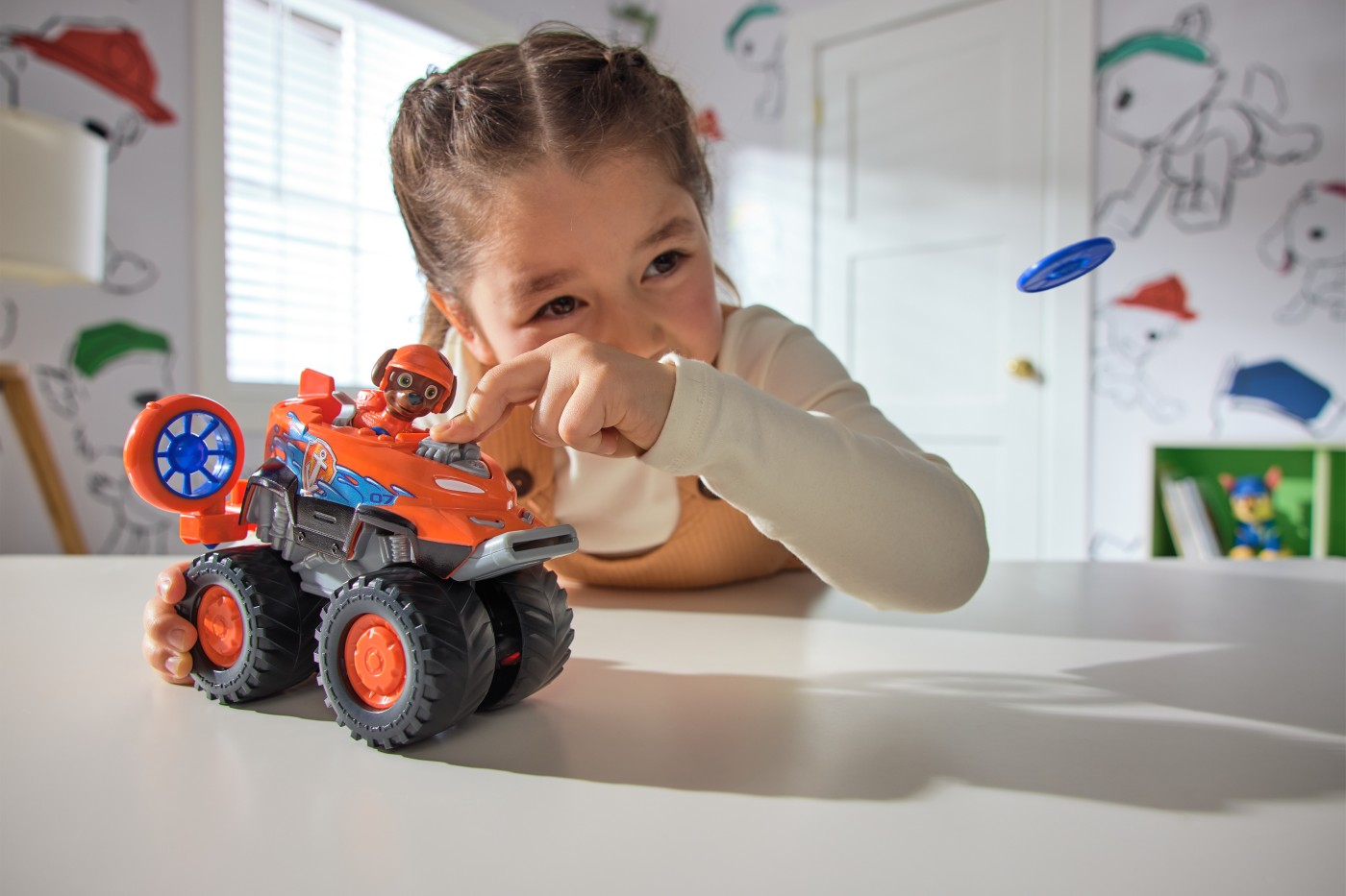 Cu roți mari și carenă robustă, acest vehicul este pregătit pentru drumuri accidentate, maluri de apă sau plaje imaginare. Designul său portocaliu cu accente albastre și roșii îl face ușor de recunoscut în orice scenă de joacă. Figurina Zuma, echipată cu casca sa de protecție, este inclusă și gata să intre în acțiune.