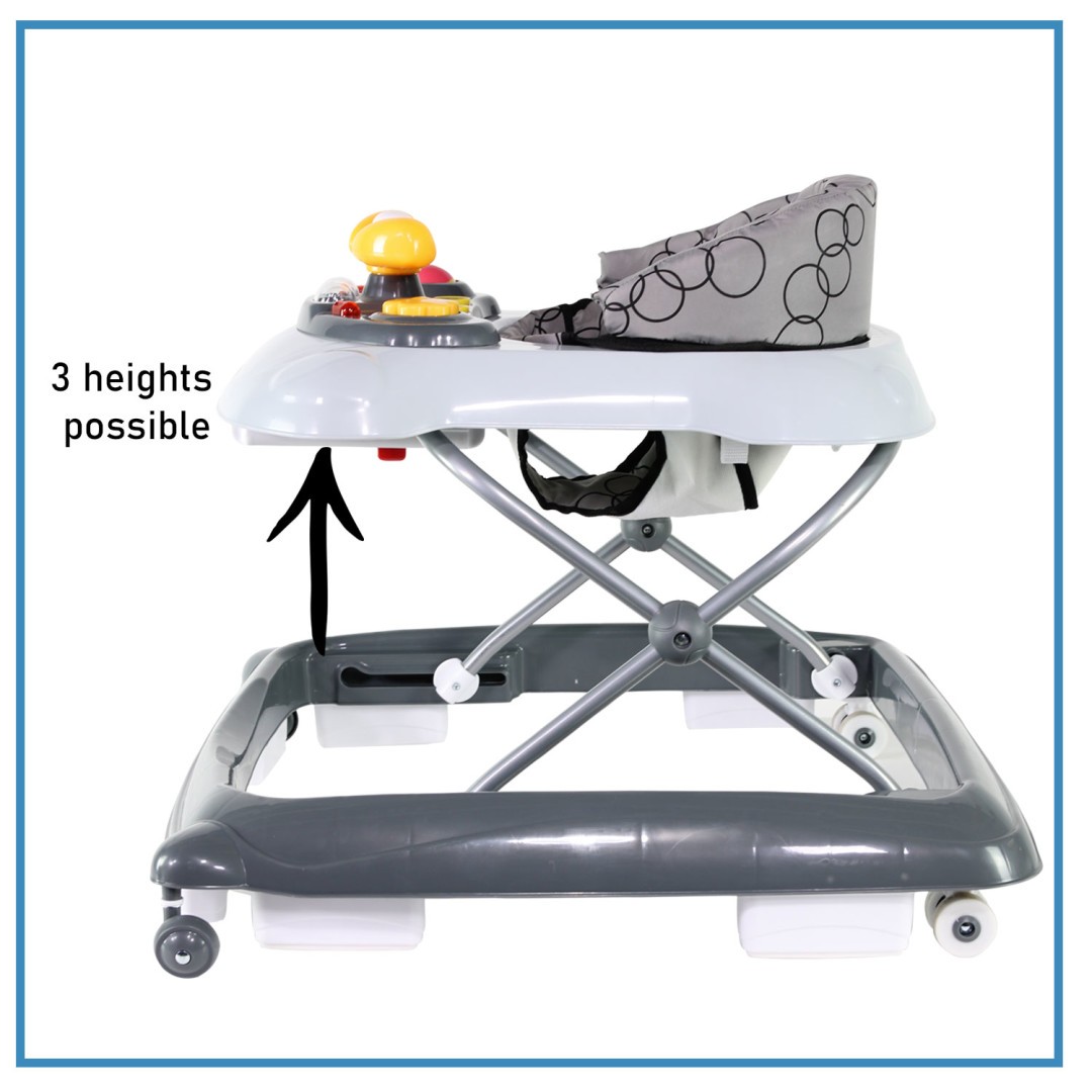 Micutul tău va face primii pași cu încredere! Basile Grey are tavă de joacă, înălțime reglabilă pe 3 nivele, pernuță lavabilă și se pliază ușor pentru călătorii.