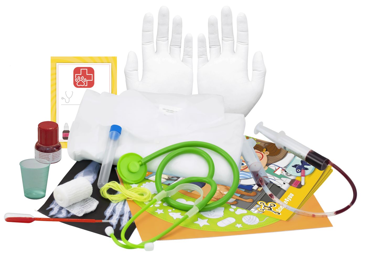 Primul meu kit de veterinar. Intra in aceasta clinica veterinara, afla despre sarcinile zilnice ale unui veterinar si descopera cat de importanta este aceasta profesie pentru a ajuta animalele! Cu aceasta jucarie de rol, vei invata totul despre animalute, concepte de baza si te vei putea imagina ca un adevarat medic veterinar! Continutul include Pigment rosu. Halat de veterinar. Radiografie. Stetoscop. Tub din plastic. Manusi. Ata de lana. Carnet de sanatate pentru animale. Cartonas decorativ guler elisabetan. Pahar gradat mic. Pipeta Pasteur. Seringi. Bandaj. Tub cu capac.