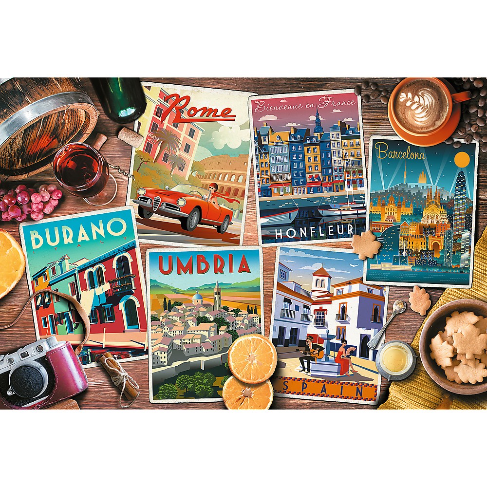 🌍 Un tur artistic al Europei, piesă cu piesă! Acest puzzle de 1500 piese te poartă într-o călătorie retro prin cele mai frumoase colțuri ale continentului, ilustrate cu stilul nostalgic al cărților poștale vechi.