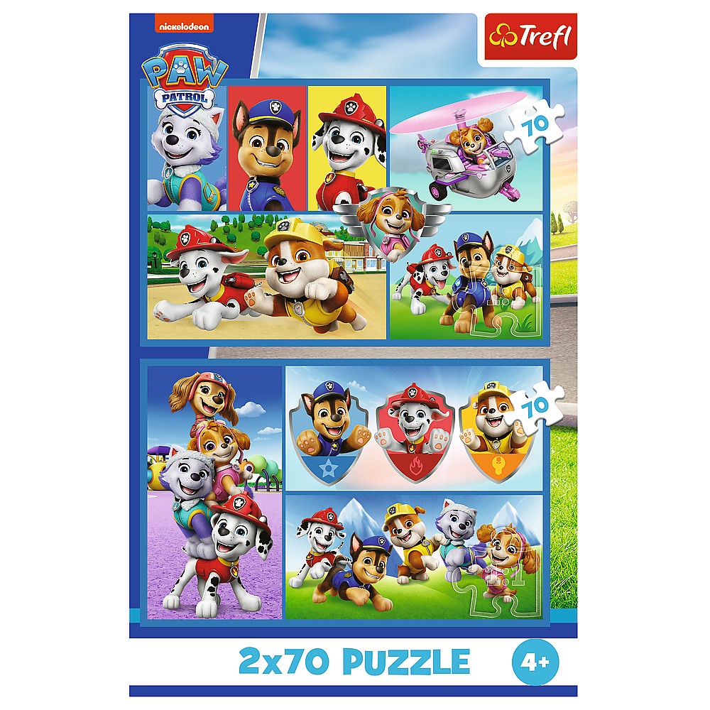 Setul conține 2 puzzle-uri a câte 70 de piese, ilustrând scene adorabile cu Chase, Marshall, Skye, Rubble și ceilalți membri ai Patrulei Căţeluşilor. Copiii vor recrea imagini pline de culoare, cu misiuni vesele și multă camaraderie! 🐾🌈