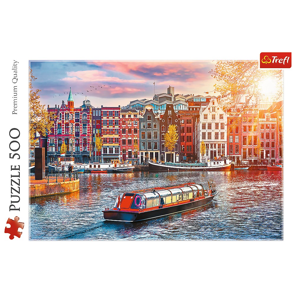 Plimbă-te pe canalele colorate ale orașului Amsterdam... fără să părăsești sufrageria! Acest puzzle de 500 de piese surprinde farmecul capitalei olandeze într-o imagine care prinde viață piesă cu piesă.