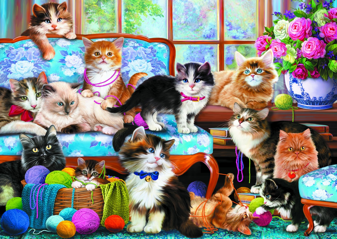 Imaginează-ți o scenă liniștită: o zi senină, flori proaspete într-o vază și câțiva blănoși curioși care se ascund printre petale. Fiecare piesă din acest puzzle prinde viață sub mâinile tale, conturând un decor casnic și cald, plin de detalii care îți vor aduce zâmbete.