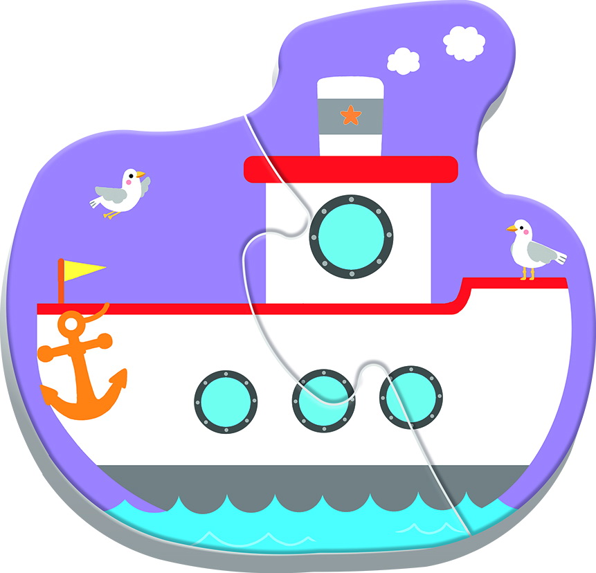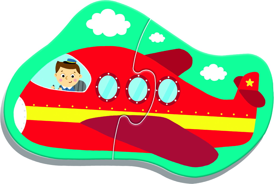Puzzle-ul include 4 imagini diferite, fiecare formată din 2 piese, în total 8 piese mari. Fiecare puzzle formează câte un vehicul: avion, tren, mașină sau autobuz.