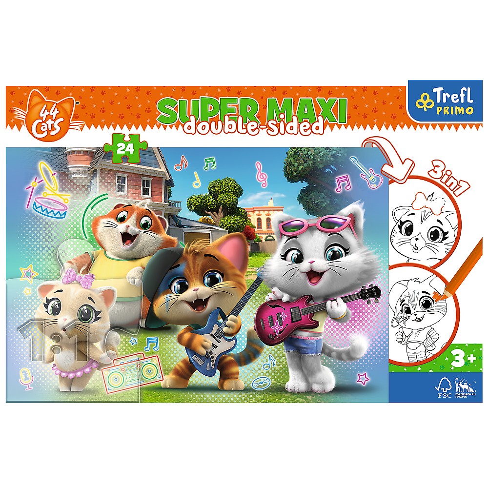 Pisicile cântă, sar și colorează! 🐾🎸 Un puzzle 3-în-1 pentru micii fani ai trupei de pisici muzicale.