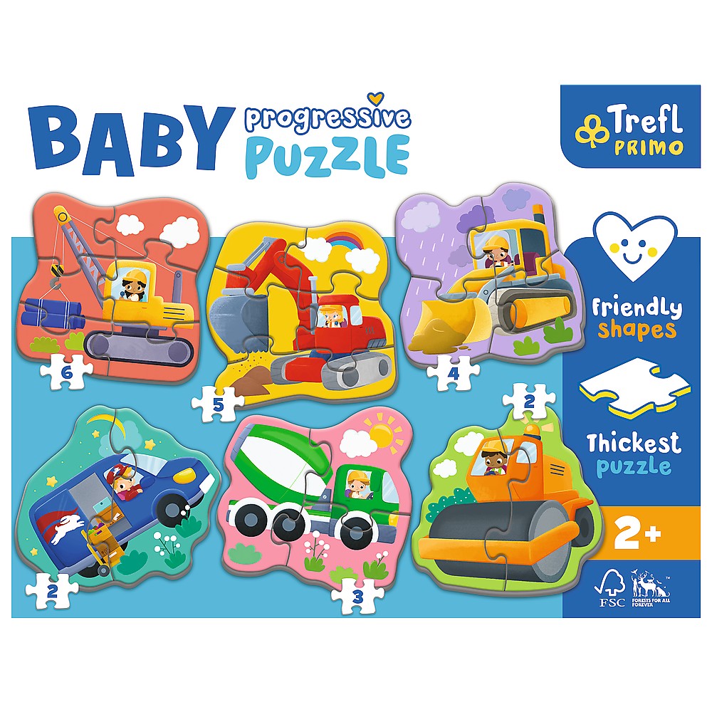 Puzzle Baby Progressive ofera pana la 6 puzzle-uri de forma mare pentru copii mici intr-un singur pachet!Setul include 6 puzzle-uri compuse din 2, 3, 4, 5 sau 6 piese, puzzle-uri fiind concepute pentru copii de la 2 ani. Numarul tot mai mare de elemente si nivelul de dificultate il fac un produs ideal pentru a incepe aventura puzzle-ului. Cel mai gros carton de pe piata si forma potrivita pentru copii a elementelor ofera o potrivire perfecta pentru mainile mici si fac puzzle-ul sigur pentru copilul dumneavoastra.Puzzle-urile Trefl PRIMO sunt combinatia dintre mare distractie si bucurie cu creatia independenta. Puzzle-urile au fost adaptate la varsta copiilor si la abilitatile lor cognitive. Acestia incurajeaza curiozitatea fata de lume, dezvolta imaginatia si abilitatile motorii celor mici.Culorile vii si formele prietenoase ale puzzle-ului ii incurajeaza pe copii sa se joace, in timp ce ilustratiile interesante le atrag atentia.Un cadou perfect pentru copiii peste 2 ani. Fabricat din materiale naturale sigure, de inalta calitate, certificate FSC.