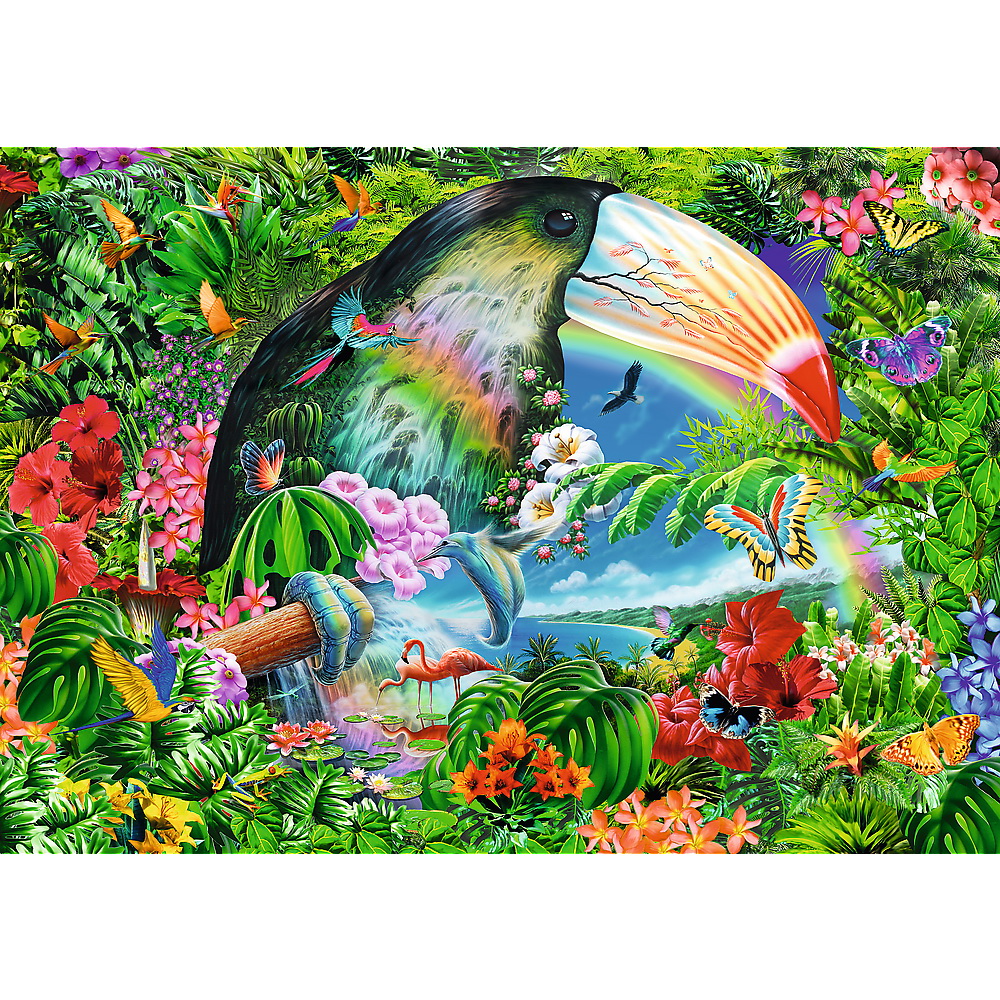 Acest puzzle de 1040 de piese te va purta într-o călătorie fascinantă printre flori exotice, tucani colorați și maimuțe jucăușe, într-un format inedit — imaginea finală se creează în formă de spirală! Dimensiunile generoase (683 x 480 mm) oferă o experiență vizuală cu adevărat captivantă.