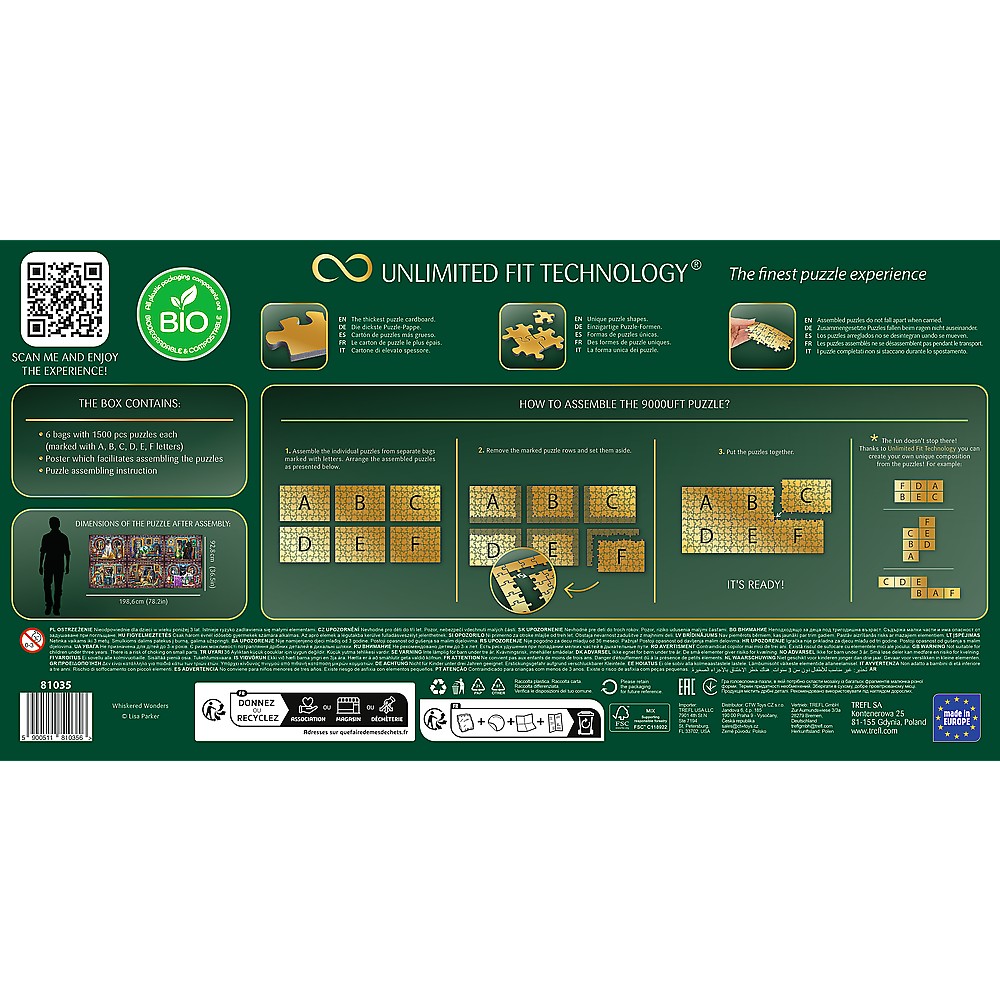 Setul conține 6 puzzle-uri de câte 1500 de piese, care pot fi asamblate separat sau unite într-o imagine spectaculoasă de mari dimensiuni: 1985,6 x 928 mm! Imaginile includ pisici enigmatice, cărți fermecate și obiecte mistice – toate în stilul unic Lisa Parker 🪄📚