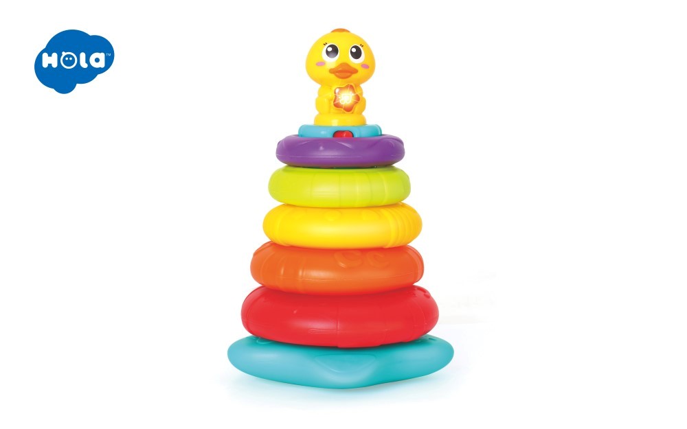 Inelul colorat și rățușca simpatică din vârf luminează și redau melodii plăcute care însoțesc fiecare etapă a jocului. Copilul este încurajat să repete activitatea și să interacționeze prin sunet, lumină și atingere.