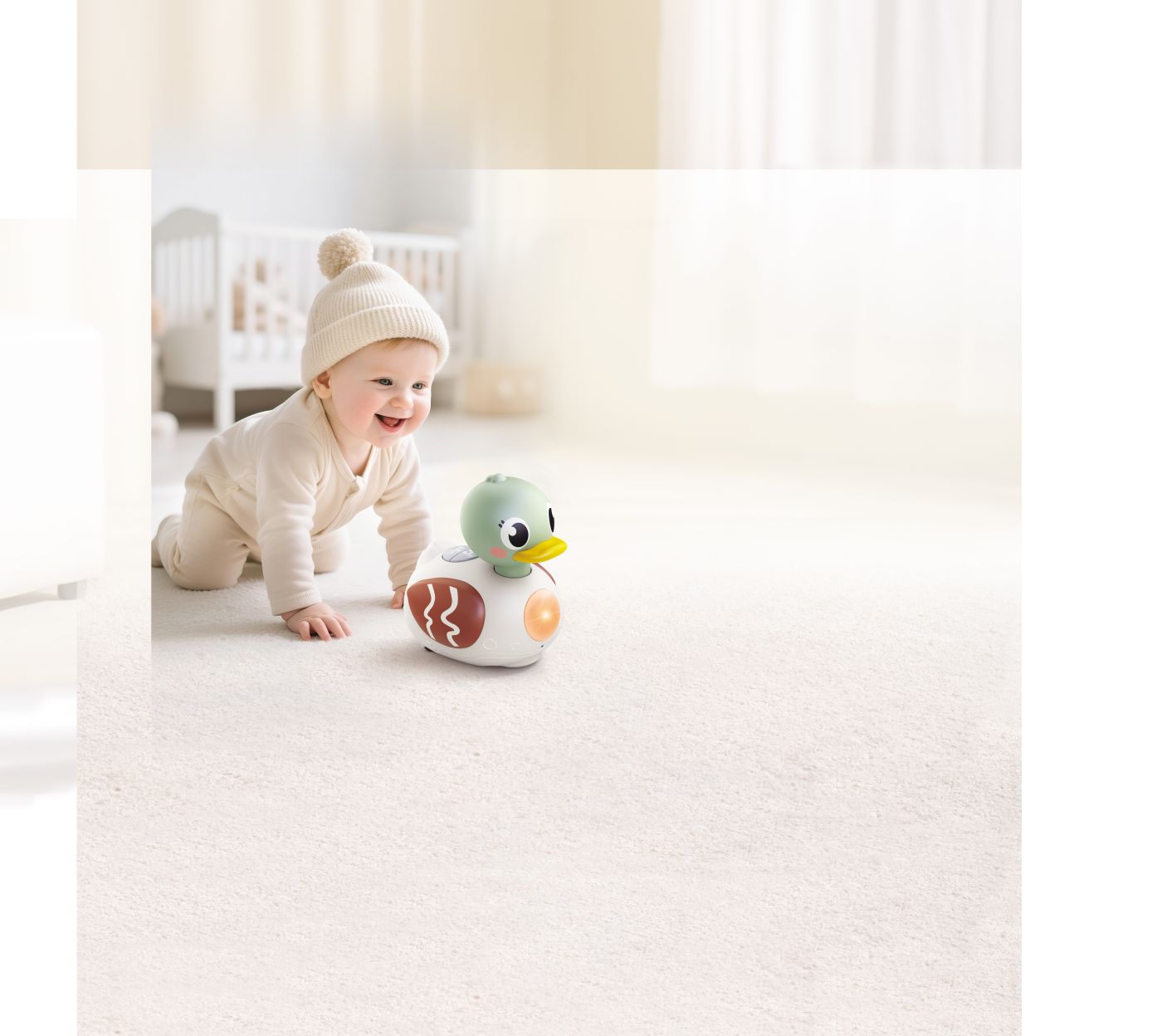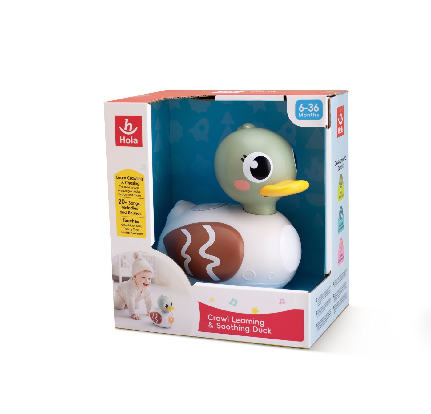 Ratusca Interactiva cu Muzica Si Lumini este o jucarie interactiva special conceputa cu varsta intre 6 si 36 de luni, care incurajeaza miscarea, explorarea si dezvoltarea timpurii prin joaca activa. Ratusca simpatica se deplaseaza pe podea si stimuleaza copilul sa se tarasca si sa o urmareasca, sustinand dezvoltarea abilitatilor motorii grosiere si coordonarea mana-ochi. Include peste 20 de melodii, sunete si efecte muzicale care capteaza atentia si contribuie la dezvoltarea simtului auditiv si a constientizarii ritmului. Designul rotunjit, culorile placute si expresia prietenoasa transforma jucaria intr-un companion ideal pentru joaca zilnica, oferind in acelasi timp timp de liniste si distractie educativa in siguranta.