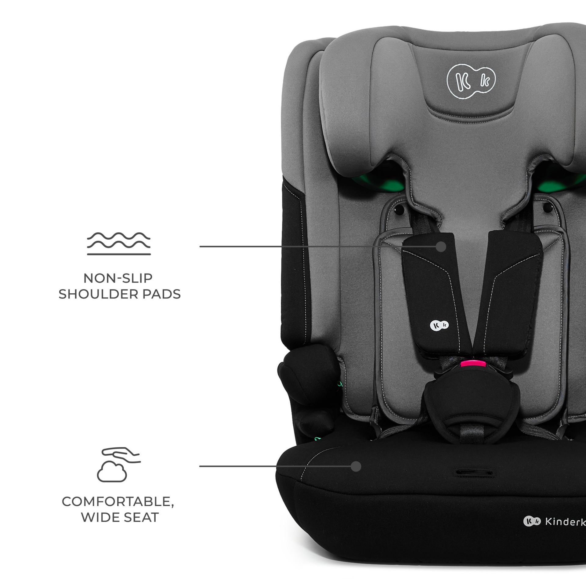 Kinderkraft I-COMFY DARK GREY dispune de 10 trepte de reglare a spătarului, pentru adaptare optimă la înclinarea banchetei. Șezutul este larg și confortabil, prevăzut cu centuri de siguranță în 5 puncte, cu pernuțe moi și strat antiderapant pe protecțiile pentru umeri. De la o înălțime de 140 cm, scaunul poate fi utilizat și ca înălțător (booster).