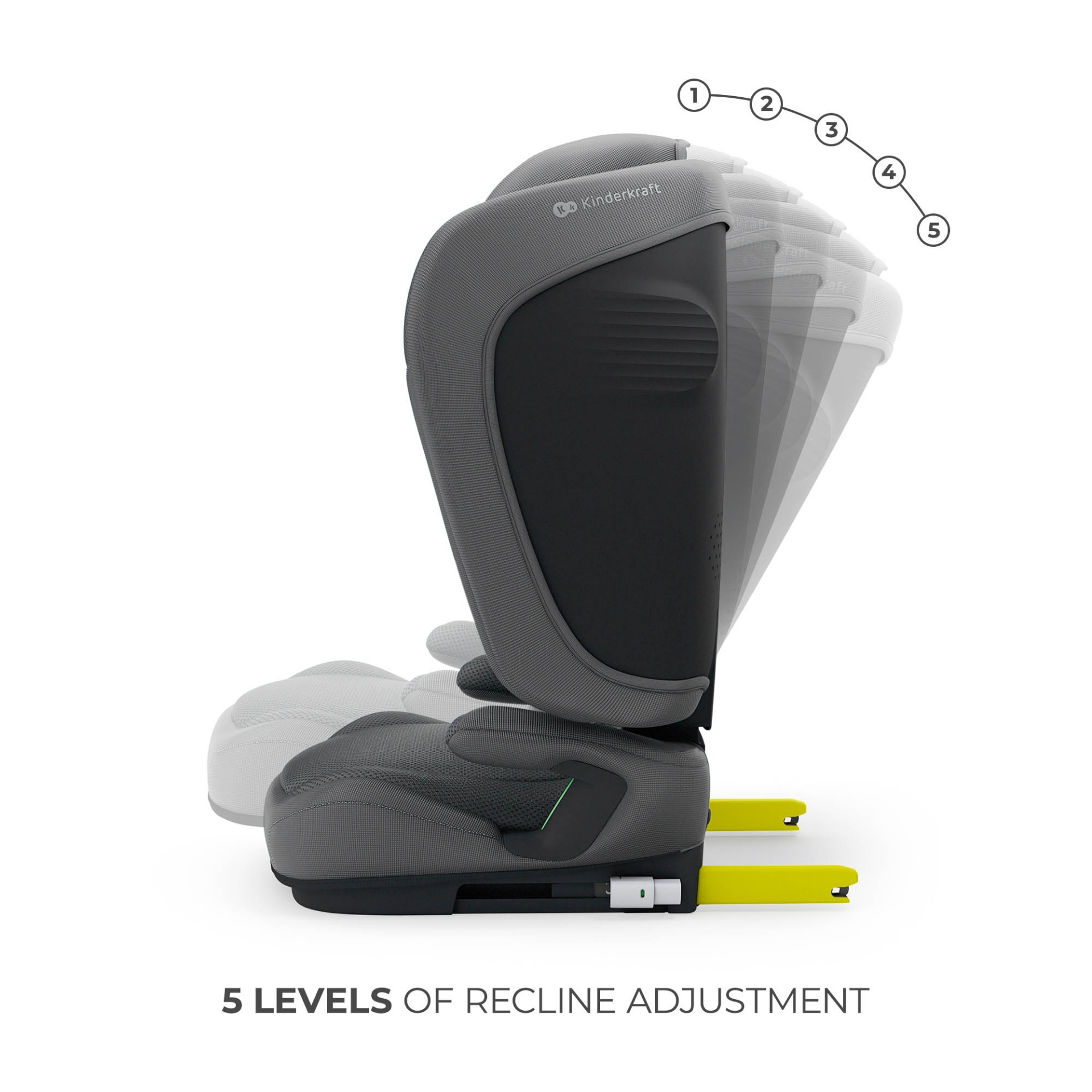 Kinderkraft UNITY 2 i-Size GREY dispune de un spătar reglabil în 5 poziții, ceea ce permite ajustarea poziției copilului în funcție de nevoile sale – pentru somn, relaxare sau călătorii active. Poziția înclinată ajută la menținerea capului în zona de protecție, sporind siguranța în caz de frânare bruscă sau impact.