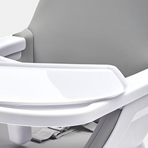 Scaunul este prevăzut cu un spătar profilat, șezut adânc și lat, tavă reglabilă cu blat detașabil, suport pentru picioare și husă moale din piele ecologică. Toate acestea asigură o postură corectă și confortabilă pentru copil, atât în timpul mesei cât și în timpul jocului.