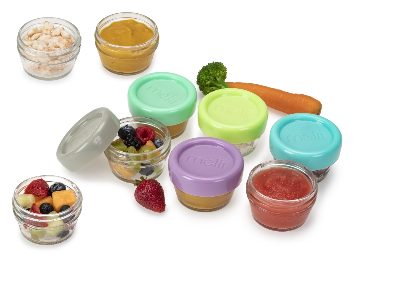 Recipientele de 59 ml pentru mâncare pentru bebeluși de la Melii fac ușor de porționat, depozitat și servit mâncarea bebelușului, blocând prospețimea, prevenind înghețarea în congelator și evitând vărsărea în geanta pentru scutece sau cutia de prânz. Inelele din silicon închid perfect capacele.
