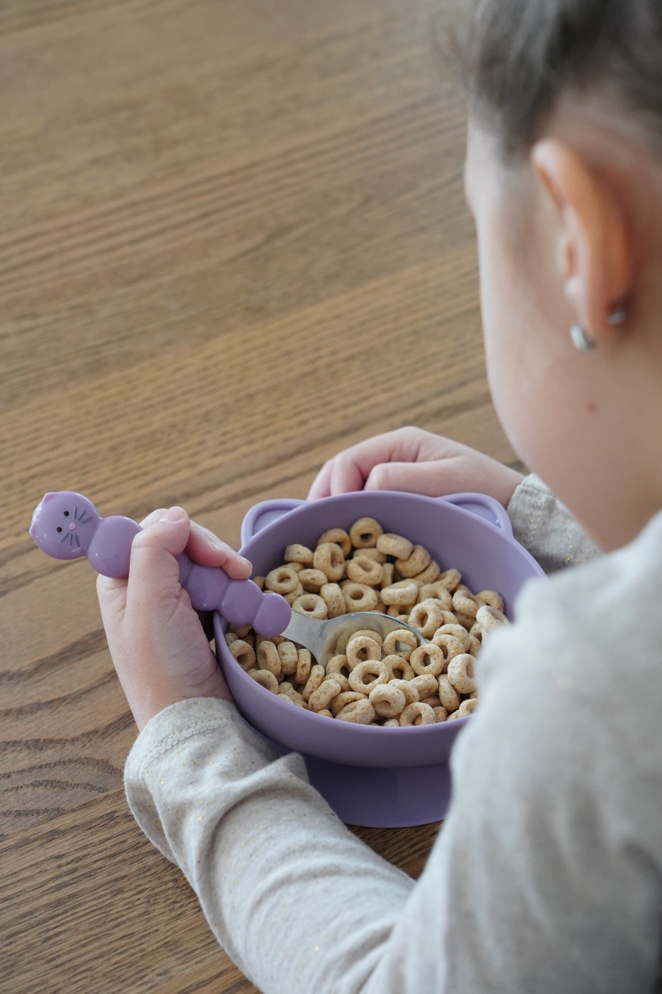 Forma de pisicuță și culorile plăcute transformă ora mesei într-o experiență veselă. Copiii sunt natural atrași de obiectele cu forme de animale, ceea ce îi ajută să fie mai curioși și mai deschiși la alimentație independentă.