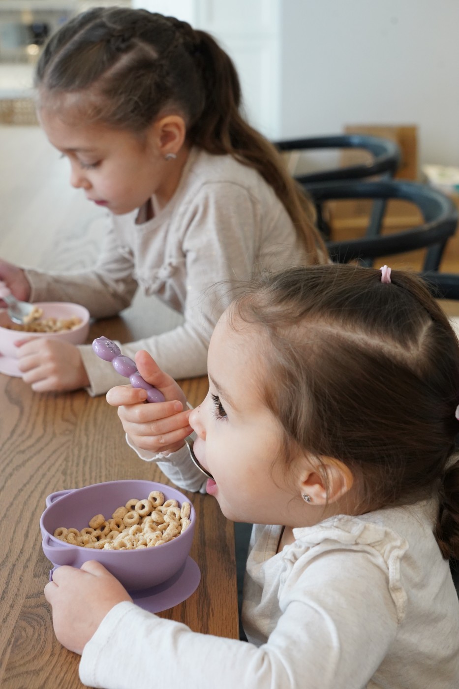 Bolurile sunt realizate din 100% silicon sigur pentru copii, rezistent și plăcut la atingere. Ventuza aderentă fixează bolurile ferm pe masă, astfel încât micuțul tău poate exersa liniștit primele lingurițe fără riscul de răsturnare.
