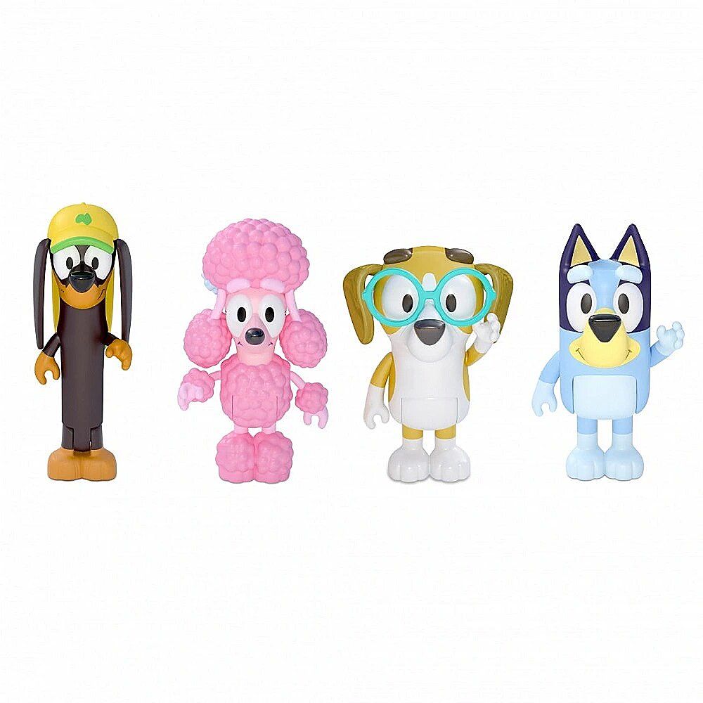 Bluey este un caine albastru de sase ani caruia ii place sa se joace. Capul ei nu este plin de altceva decat de idei interesante! Împreuna cu sora lui mai mica, Bingo traieste multe aventuri amuzante. Friends este un set de patru figurine de caini, care este format din Bluey, Snickers, Coco si Honey. Lasa casa sa rasune de sunetele vesele ale rautatii copiilor! Figurile de basm cu parti mobile ale corpului sunt perfecte pentru jocul creativ. Ele ofera prescolarilor posibilitatea de a recrea povesti cunoscute din animatii sau de a crea noi aventuri Bluey.