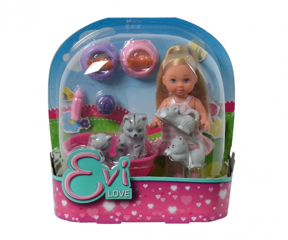 Papusica Evi este pur si simplu indragostita de animalute. Ii place sa aiba grija de ele, sa le plimbe si sa le hraneasca. In set sunt incluse si accesorii si cosulete in care animalutele se pot odihni si dormi.