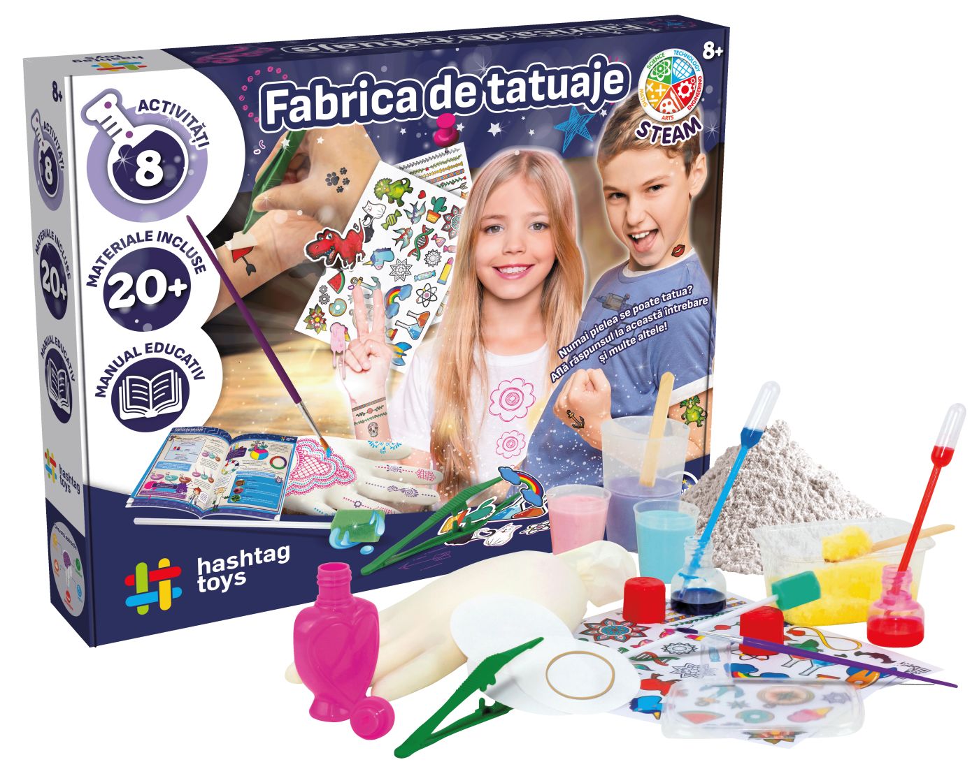 Creeaza-ti propriile tatuaje cu aceasta Fabrica de tatuaje! Nu rata sansa de a-ti pregati propriile cerneluri si de a descoperi originea si stiinta din spatele tatuajelor temporare. Vei gasi, de asemenea, peste 60 de tatuaje gata de aplicat pentru tine sau prietenii tai! Continutul setului banda elastica, manusa, filtre de hartie, cupe mici gradate, pipete Pasteur, cupa mare gradata, spatule din lemn, pensula, colorant cosmetic albastru, colorant cosmetic roz, ghips, recipient cu capac, sticluta in forma de inima, penseta, burete, tatuaje prin transfer.