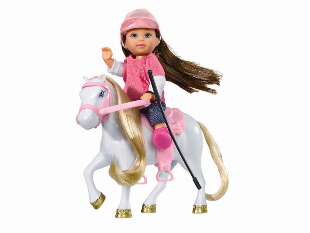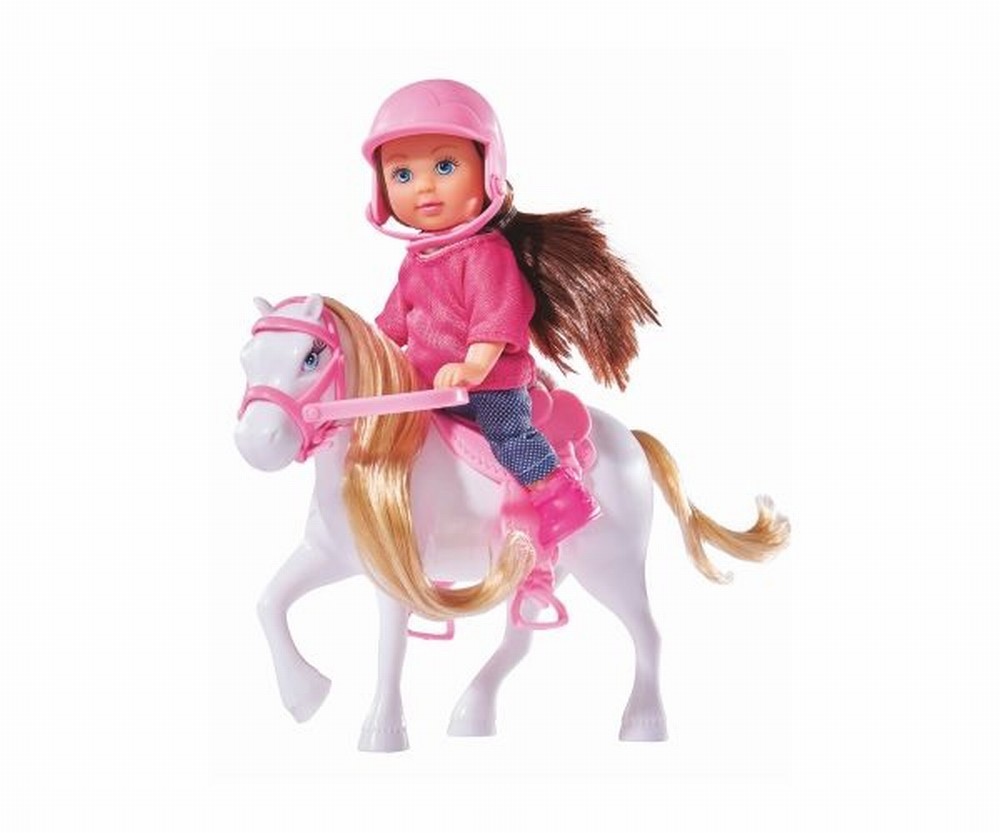 Evi este o papusa foarte dragalasa, care e intotdeauna la moda si careia ii place la nebunie culoarea roz. Evi Love cu calut arata superb in costumul ei fantastic de echitatie si este destul de clar ca ii place foarte mult sa calareasca. Fiind un calaret pasionat, ii place sa se urce in saua calutului si sa porneasca in noi aventuri.