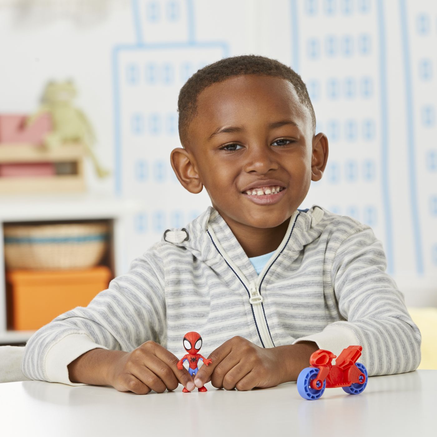 Este timpul Spidey! Aceste jucarii Spidey and His Amazing Friends vin cu o silueta si o motocicleta pentru o joaca plina de actiune. Silueta de 2,5 inci poate merge cu adevarat cu bicicleta, astfel incat prescolarii isi pot imagina ca se vor ajuta cu echipa Spidey. Cu aceste seturi de figurine si vehicule Marvel prescolare, distractia este la o plimbare distanta! Aceste seturi de jucarii Spidey sunt cadouri grozave de sarbatori sau de ziua de nastere pentru copiii de la 3 ani in sus, care iubesc aventurile lui Spidey, Miles Morales Spider-Man, Ghost-Spider si toti prietenii si dusmanii lor! Acest pachet contine personajul Spidey.