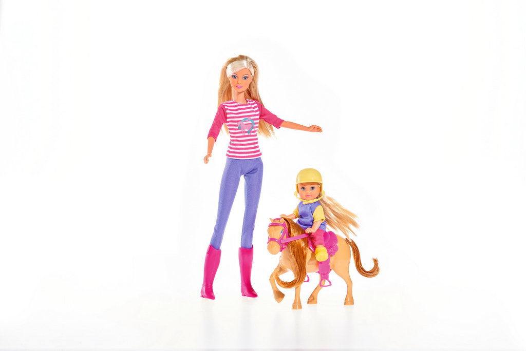 Papusi manechin de 29 si 12 cm, impreuna cu un ponei cu par real foarte frumos aranjat. Papusile Steffi si Evi se intalnesc pentru o sesiune de calarie ! Papusi manechin 29cm si 12cm Steffi se pregateste pentru rolul ei de instructor de calarie. Ea va putea sa o invete pe Evi sa calareasca un ponei ! Setul contine 1 ponei, casca de protectie, 1 sa si cele 2 papusi.
