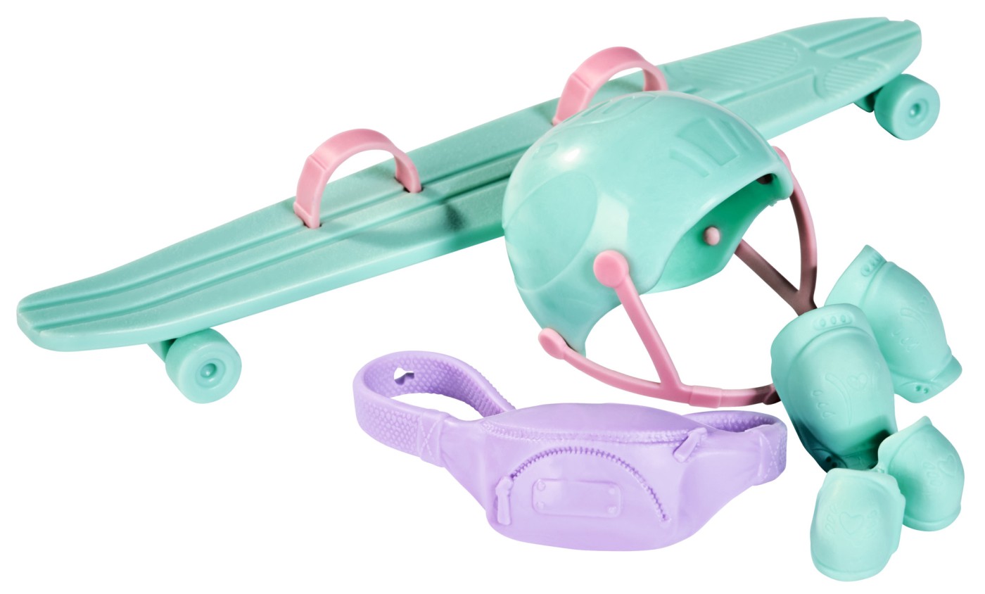 Steffi poarta o tinuta cool, cu longboard, protectii si casca si o geanta de umar. Inaltime papusa 29 cm