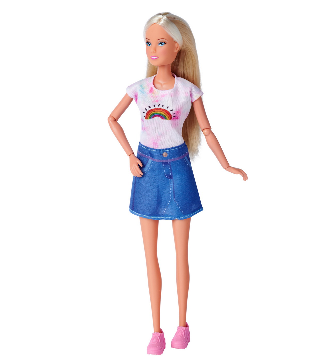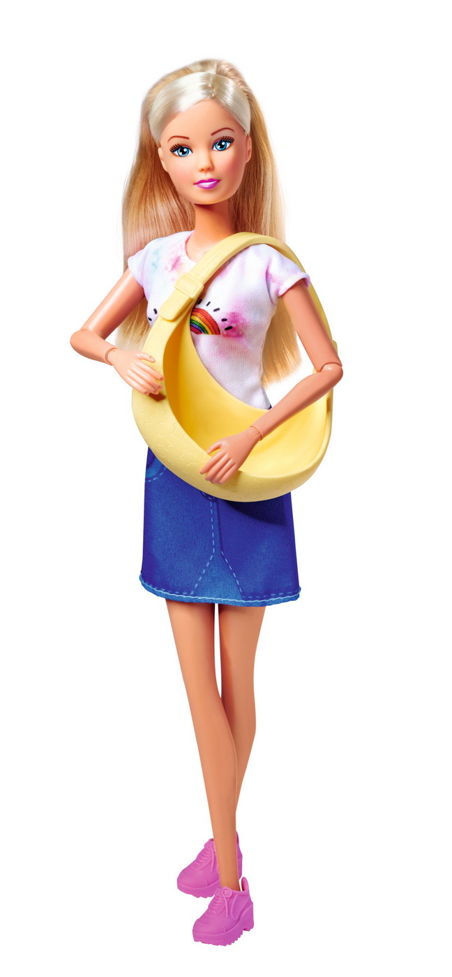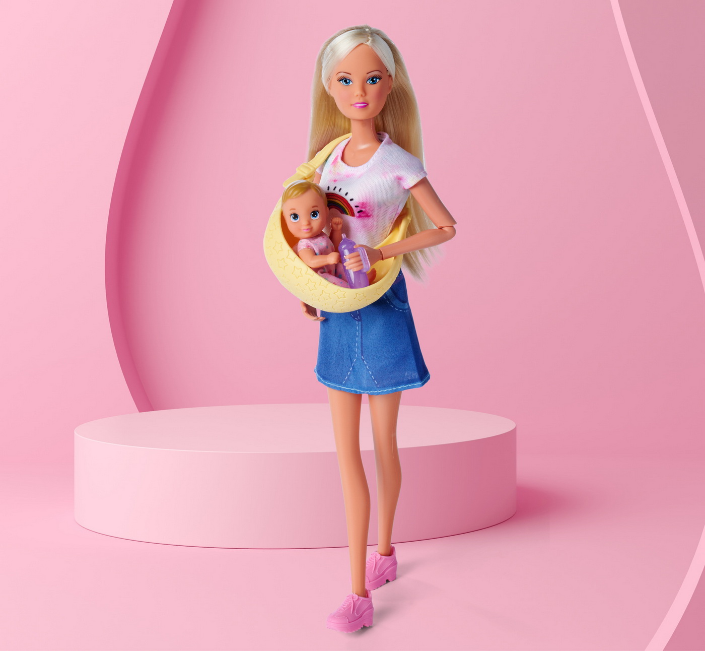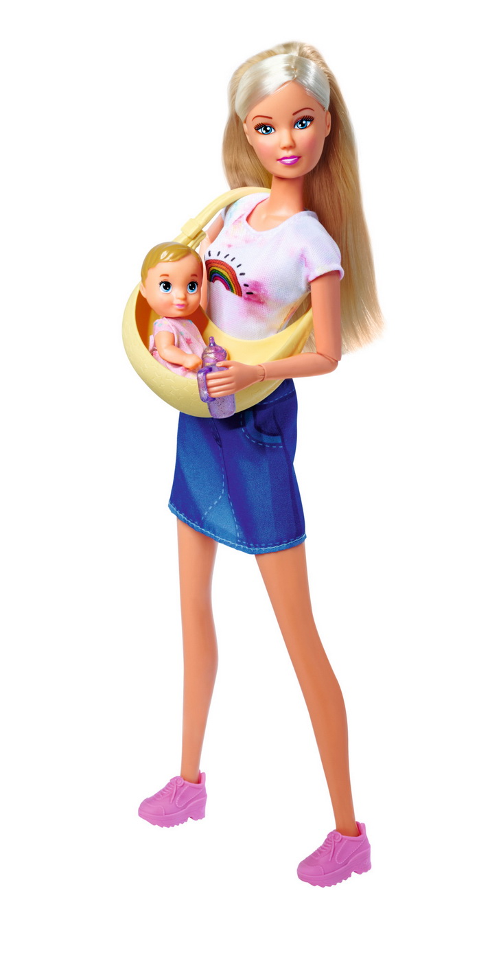 Steffi cu bebelus, port bebe si sticluta. Inaltime papusa 29cm.Steffi cu bebelusul ei dulce poate merge oriunde. Port bebe-ul este perfect pentru a tine un bebelus, datorita caruia poate fi mereu aproape de mama lui. Biberonul atasat va facilita ingrijirea zilnica a bebelusului. Inaltime bebelus 7 cm