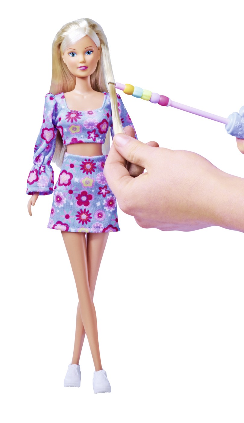 Lui Steffi ii place sa-si coafeze parul si sa incerce coafuri noi. Cu betisorul de perle isi pune perle colorate in par. Pentru a face acest lucru, atasati mai intai o banda de cauciuc, apoi margelele de tija, trageti ochiul si impingeti margelele pe o suvita de par. Functioneaza si in parul copiilor. Pe langa diverse margele colorate si elastice, setul contine si o perie roz cu design floral pentru pieptanat parul.
