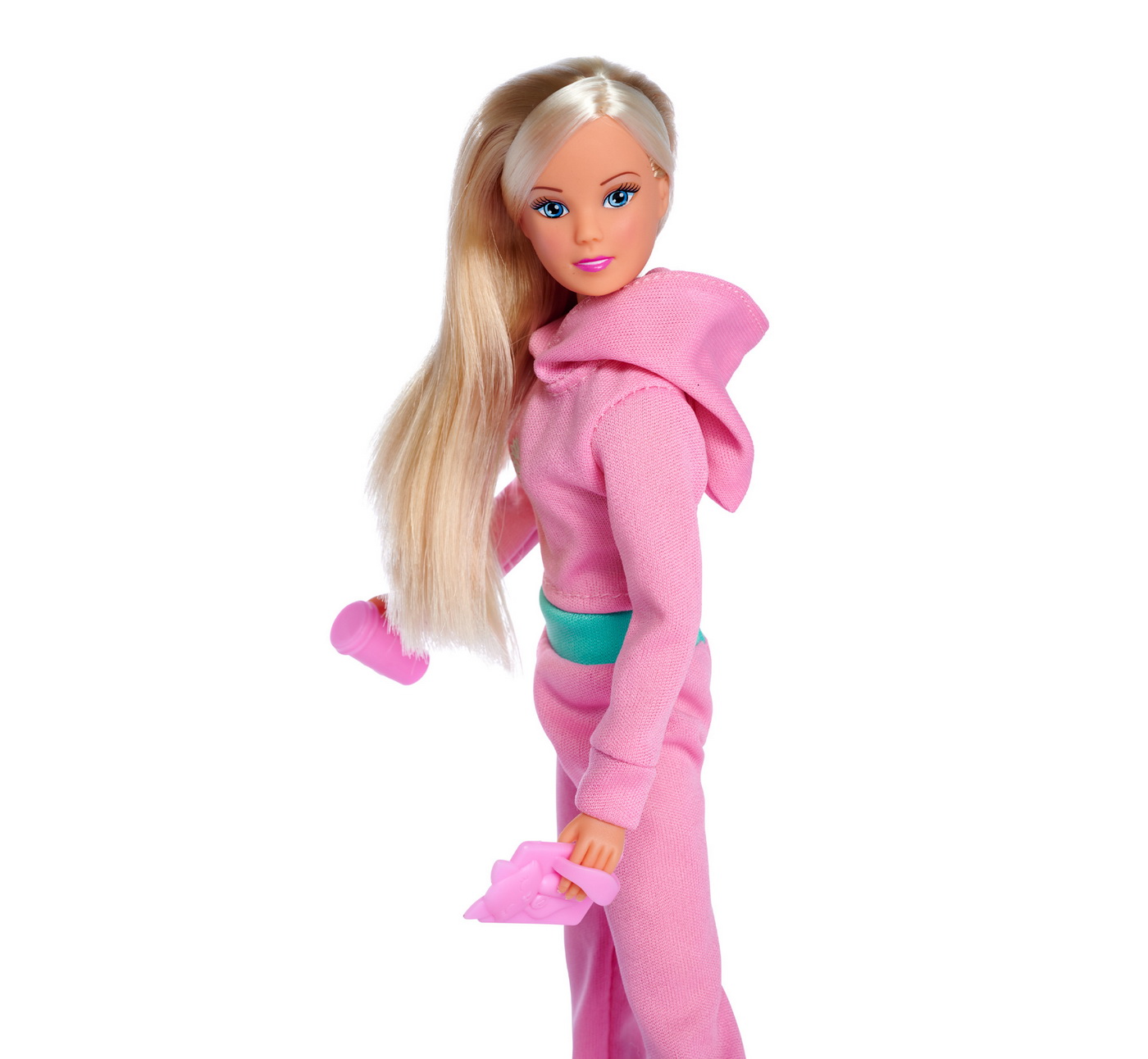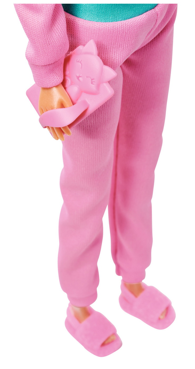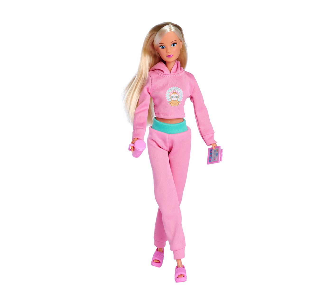 Steffi este imbracata intr-un trening la moda, asortat cu tableta si incaltamintea, inaltime papusa 29cm.Steffi LOVE este o adevarata papusa de moda. Are o tinuta confortabila. Costumul la moda din doua piese al lui Steffi este format din pantaloni roz comozi, cu o curea verde si un hanorac asortat cu un design dragut.Continutul setului pe langa papusa Steffi, setul contine si un pahar elegant, o tableta si o pereche de papuci roz asortati.