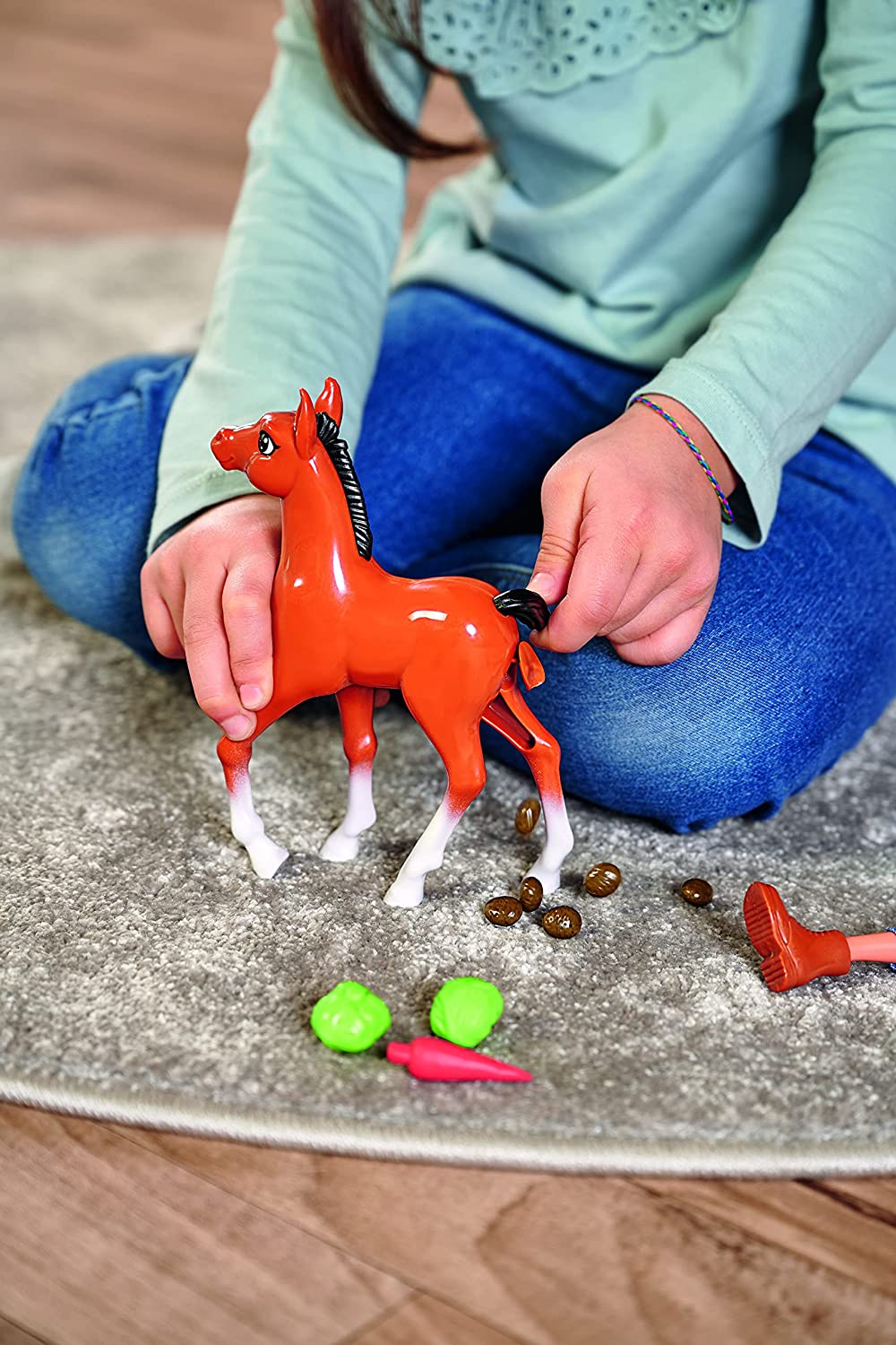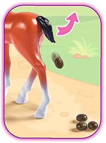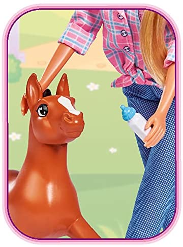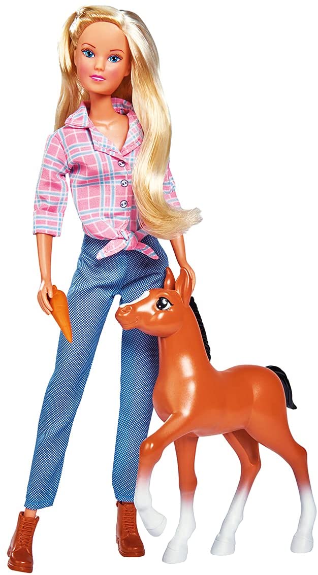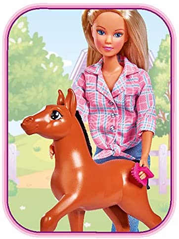Papusa Steffi Love cu inaltimea de 29 de cm cu calut care are functii si accesorii. Insotita de micul ei calut, papusa Steffi Love este pregatita pentru noi aventuri. Papusa cu paruul blond este imbracata intr-o pereche de blugi albastri si o camasa roz in carouri iar in picioare are po pereche de bocanci maro. De asemenea, pachetul contine mancare cat si produse de ingrijire a noului ei animalut.