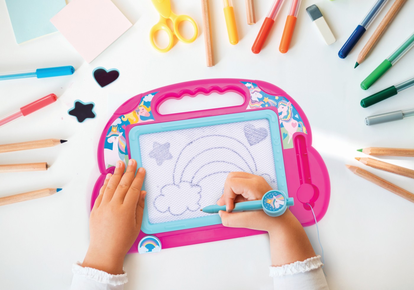 Designul plin de culoare cu tematică fantezie, unicorn și curcubeie îi va cuceri pe copii. Datorită celor două ștampile speciale, pot crea forme haioase și povești desenate, dezvoltându-și creativitatea și coordonarea.