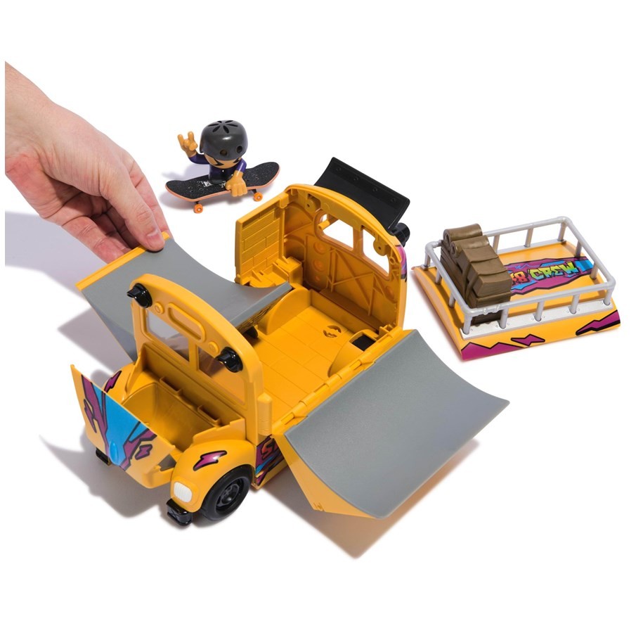 Transformă-ți camera într-un skatepark pe roți! 🚍🛹 Setul Tech Deck SK8 Crew Autobuz vine cu rampe, trick-uri și un autobuz cool ce devine parc de joacă pentru degete.