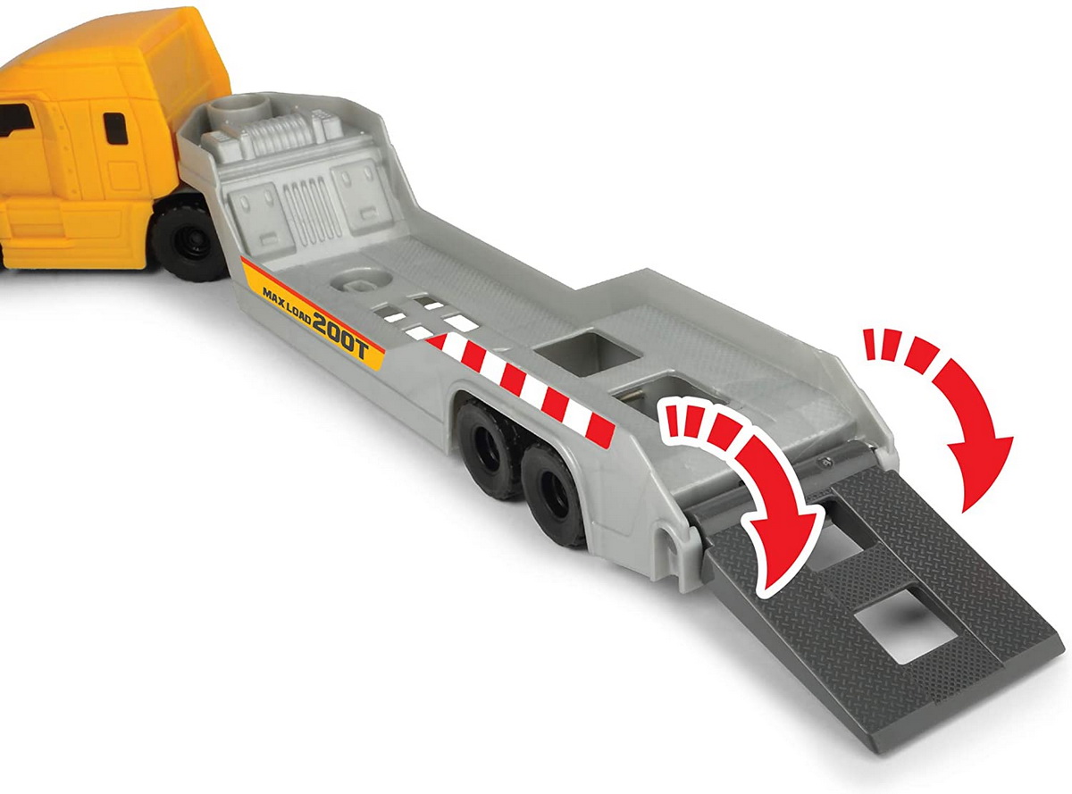 Un set realist de construcții 🚧, cu trailer Volvo Mack de 32 cm și două vehicule de șantier (tractor și basculantă). Ideal pentru copiii pasionați de utilaje și jocuri de rol.