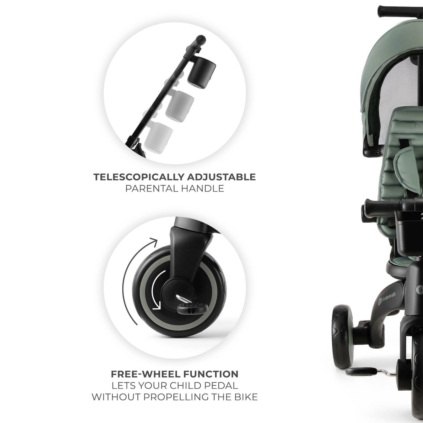 Tricicleta Kinderkraft JAZZ 2 Green este un model pliabil 5 în 1, creat pentru copiii între 9 luni și 5 ani, care se adaptează perfect fiecărei etape de dezvoltare. Se pliază rapid, are scaun pivotant 360°, poziții multiple de reglare și un design modern, confortabil și sigur. O soluție completă pentru plimbări zilnice pline de zâmbete.