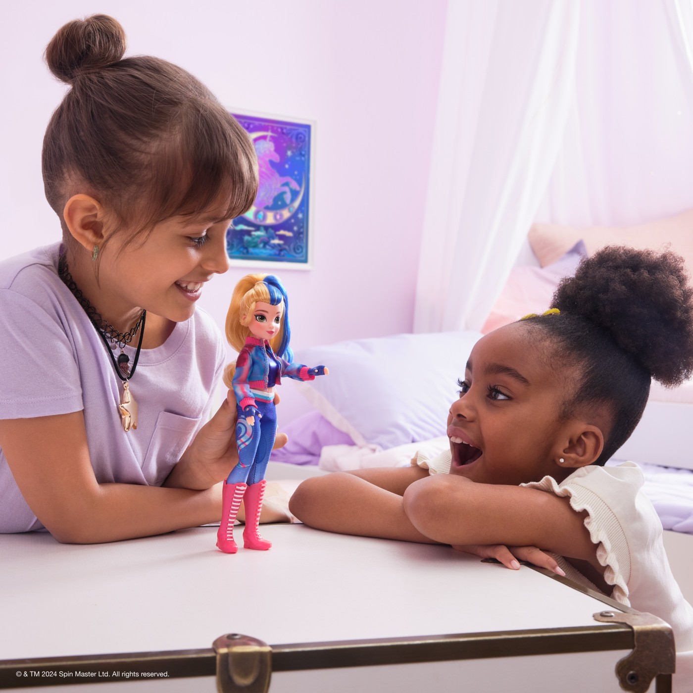 Creeaza acasa aventuri fermecatoare Academia Unicorn cu papusile la moda Sophia, Ava si Isabel. Inspirate din serialul animat NETFLIX si din seria de carti de succes in care prietenia tine fraiele, aceste papusi de 24,1 cm pentru fete dau viata personajelor. Frumos detaliata din cap pana in picioare, personalitatea efervescenta a Avei iese la iveala in parul ei cu suvite (accesoriu de coafat inclus) si in tinuta ei caracteristica de calaret de unicorn rochia roz si albastru-verzui, pantaloni ombre cu marcaje Magia plantelor, cizme florale si agrafe de par, manusi si accesorii pentru papusi cu centura cu fluturi. Cu 9 puncte de articulatie, pozitioneaz-o pe Ava in timp ce protejeaza Insula Unicornului si magia sa si calareste in aventura cu unicornul ei, Leaf (vandut separat). Legaturile magice dintre elevii Academiei Unicorn si unicornii lor vor starni povesti pline de imaginatie. Pentru mai multe moduri de a experimenta Academia Unicorn alaturi de personajele tale preferate, cauta papusile Sophia si Isabel si unicornii lor, Wildstar Lumina Curcubeului si River (suvoi) (fiecare se vinde separat) si extinde-ti lumea. Pentru copiii carora le plac unicornii si jucariile cu cai, papusile si accesoriile, jocurile de casa de papusi, jucariile de colectie, jucariile de plus si multe altele, jucariile Academia Unicorn sunt cadouri distractive de de ziua de nastere pentru fete sau cadouri pentru orice ocazie.