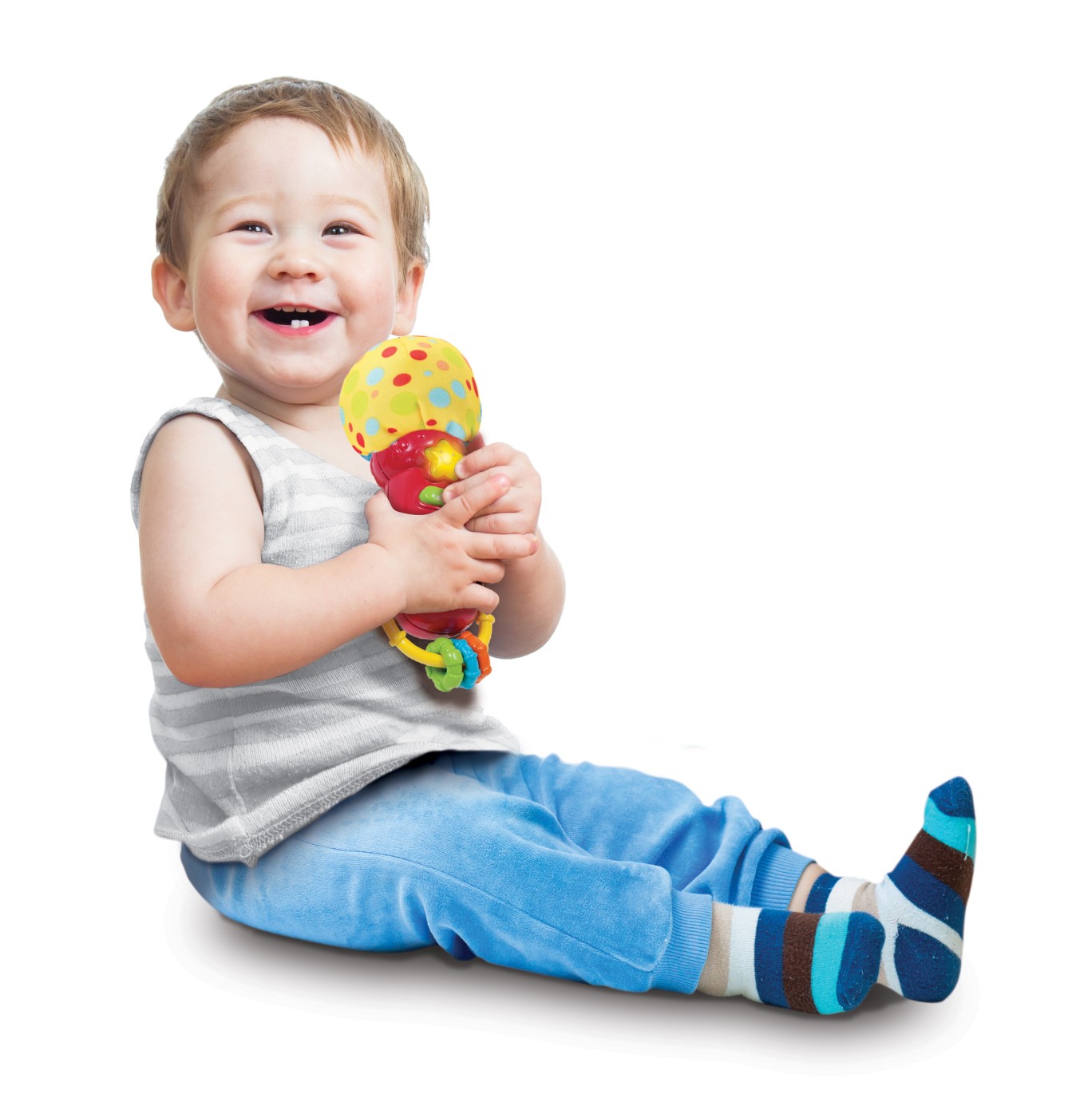 Microfon interactiv cu lumini și texturi speciale, ideal pentru bebelușii de la 3 luni care încep să descopere sunete și culori! 🌟🎶
