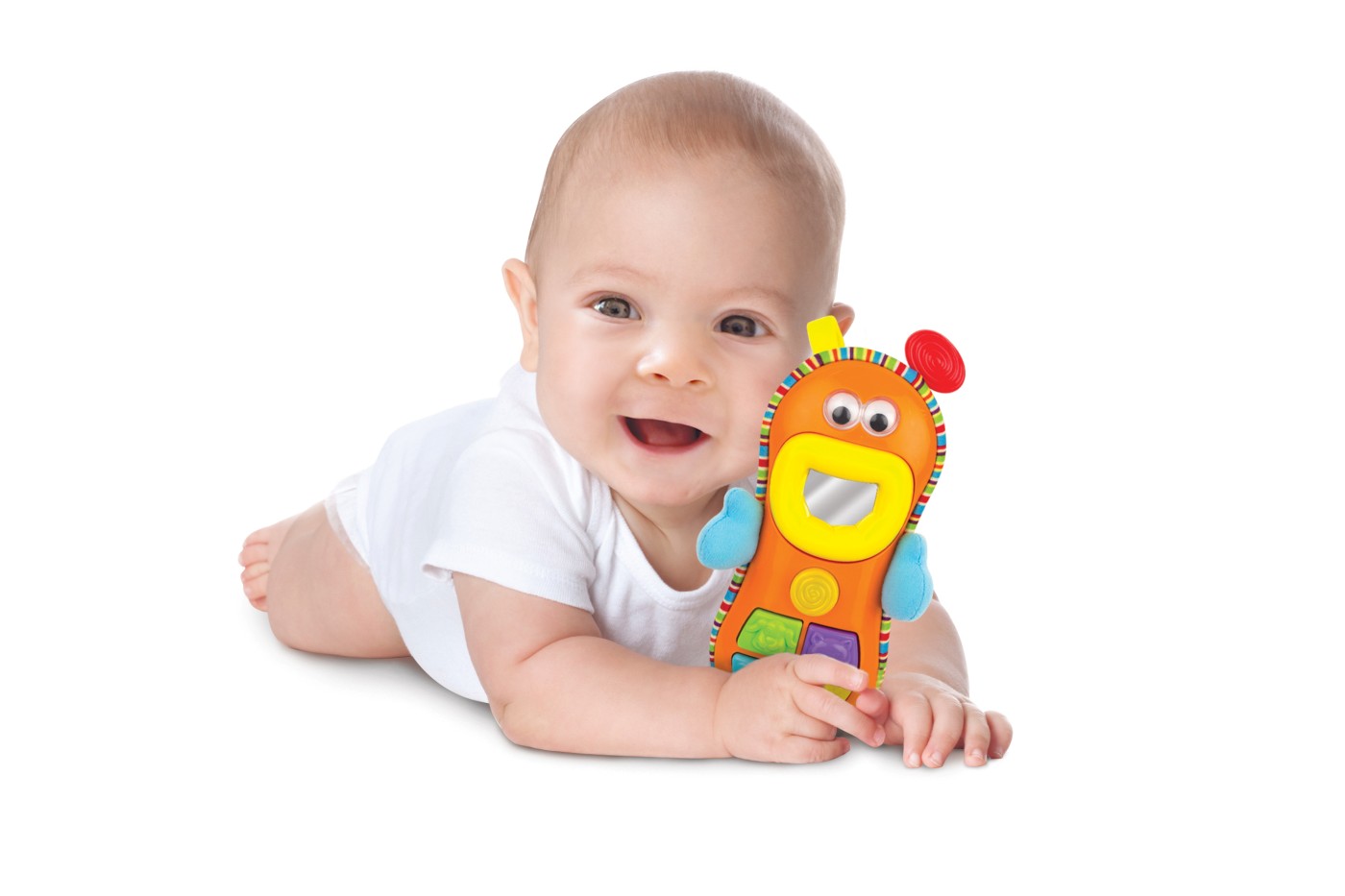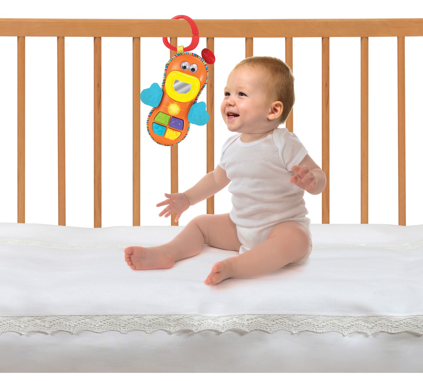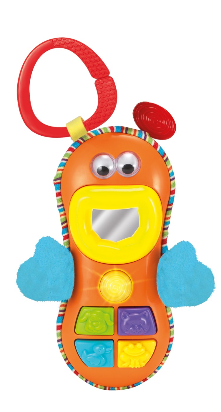 Butoanele luminoase și efectele sonore captivante transformă fiecare apăsare într-o mică surpriză. Oglinda și ochișorii care se mișcă adaugă o doză de interactivitate și distracție suplimentară! Jucăria este ușor de prins și se poate atașa cu inelul special la cărucior sau pătuț, fiind ideală pentru joaca de acasă sau din plimbări. 🔆📲