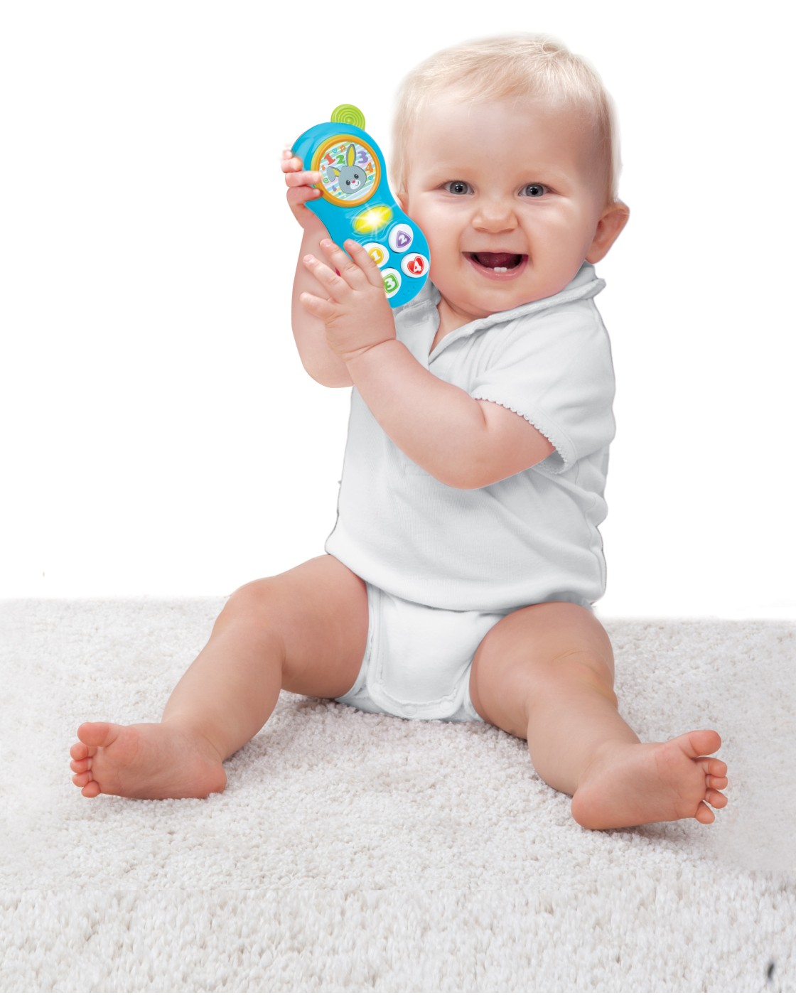 Telefonul are patru butoane luminoase numerotate, fiecare activând sunete, melodii sau efecte amuzante care captează imediat atenția celor mici. Pe lângă distracția oferită, acestea îi ajută pe bebeluși să descopere primele noțiuni despre numere, sunete și reacții.